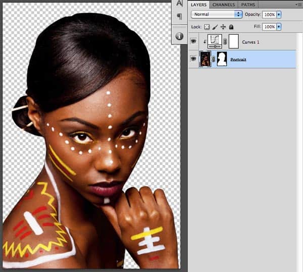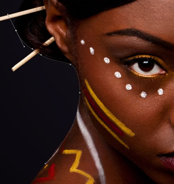 Open the Tribal beauty photo. First of all we need to extract the woman from the original background of the photograph. We don’t need to include the sticks in her hair, which makes the selection a bit easier. As the background and the foreground are too close to each other in colors we will you use the Pen tool for the selection. You can see the end result of the masking on this image: