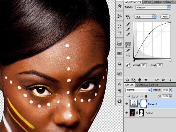 The mask will hide the original background, where you should see transparent pixels now. Next thing we need to do is to brighten up the portrait. We are going to use a Curves Adjustment layer with the following curve: