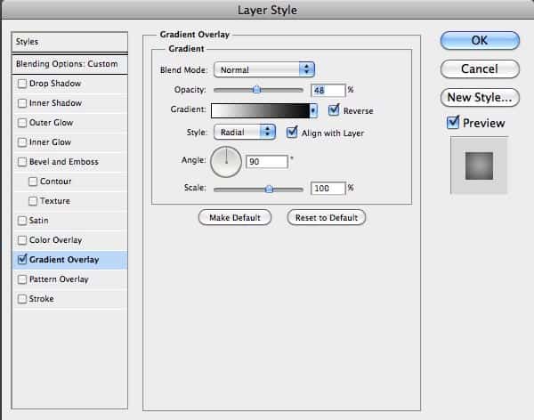 We need to create a new layer at the bottom of the layer structure. Fill in this new and empty layer with white (press D and then Ctrl/Cmd + Backspace) and then apply the following layer style on it: