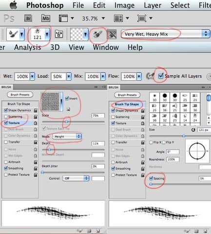 - If you have a tablet use Shape Dynamics too and set the Size Control to Pen Pressure (if you work with a mouse you don’t need this)