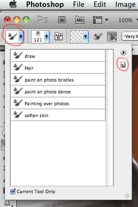 After all these settings it is worth saving this brush setup for later use. Let’s save it as a Mixer Brush Tool preset. Click on the far left icon on the control bar and click on the new icon and name the brush Painting over photos.