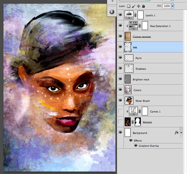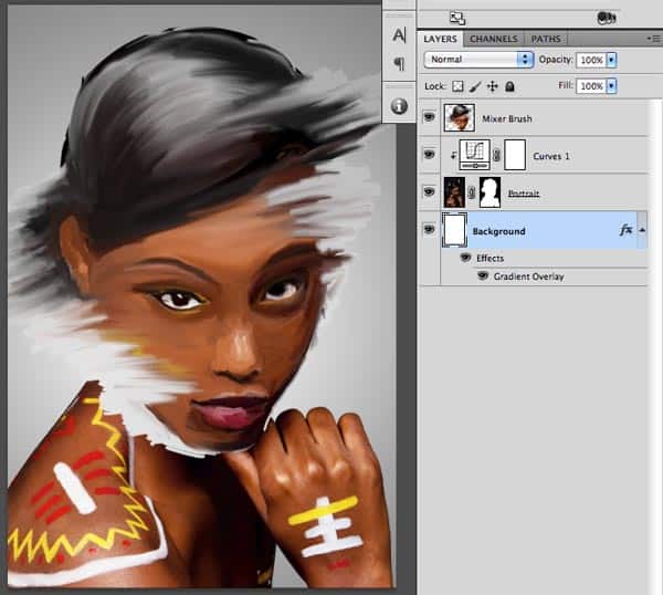 After this point you can turn off the Portrait layer, which will also turn off the clipped Curves Adjustment layer. We don’t need them anymore, but it is good to keep them in case we want to add some more detail to the Mixer Brush layer (like the hand for instance).