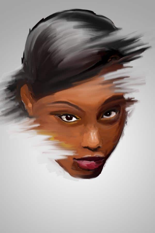 Make sure you have the new empty layer selected before you start painting over the photo. With this setup on the Mixer Brush you will be able to paint over the portrait blend details together. The Mixer Brush will not only use the portrait layer but it will also sample from the background, which will help us to break up the original edges of the face to make it a bit more artistic, painterly. Try to keep the details on the eyes, nose and mouth but you can be much more loose on the other parts of the face. Use your creativity in this step.