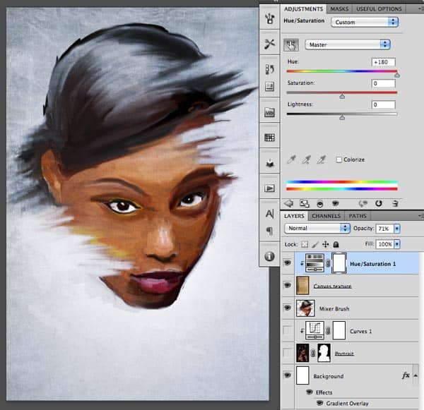 It is time now to add more canvas feel to our painting with the image you can download from the link I included at the start. Open up this image and drag it on top of our composition and name the layer Canvas Texture. Set the blend mode to Overlay and then create a Hue/Saturation adjustment layer with the following options (this adjustment layer has to be clipped to the texture layer):