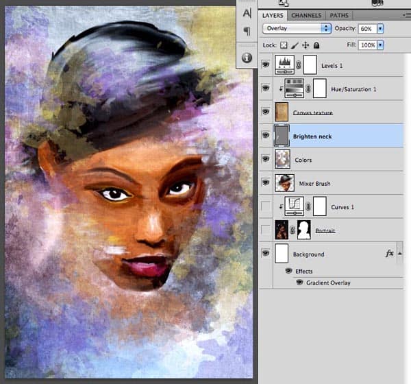 Now we need to show the neck somehow. An interesting way to do it is to brighten the background instead of outlining the curve of the neck. This technique is very similar of using a sponge or a cloth to smudge and brighten up parts of your painting. The way we can easily do it in Photoshop is to make a new layer above the Colors and below the Canvas Texture, then fill this layer with 50% gray (Edit/Fill option with 50% gray option), set the blend mode to Overlay and the opacity to 60%. Once you are ready with this you will need to use the Brush tool with a soft edge brush set to white color and 20% opacity on this layer. Simply brush over the neck and maybe other areas as well a couple of times where you feel a bit of brightening would help the overall look. Optionally you can also darken with this layer if you change your brush color to black.