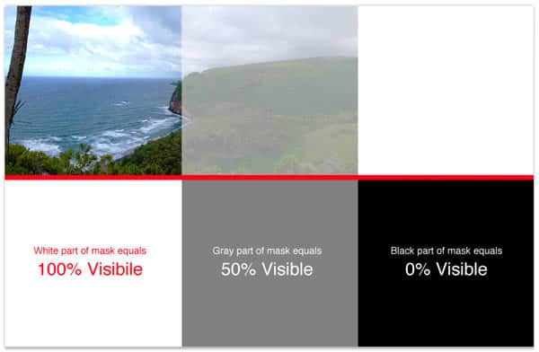 First thing to remember relating to masks in RGB mode: White = Visible / Black = Not Visible. Any shade of Gray is a form of partial visibility (Transparency) and it relates to the spectrum range. For example, the closer the shade of gray is to white the more visible it will be from the mask. Dark gray will be less visible because it’s closer to black.