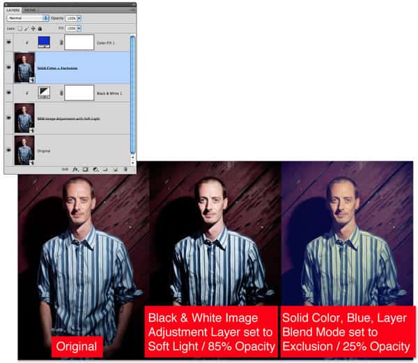 As seen here, if I just make a black and white Image Adjustment Layer and then change the blend mode to Soft Light I get a greatly more dramatic image. Or try using a blue solid color layer and an Exclusion blend mode, that starts looking “vintage”.