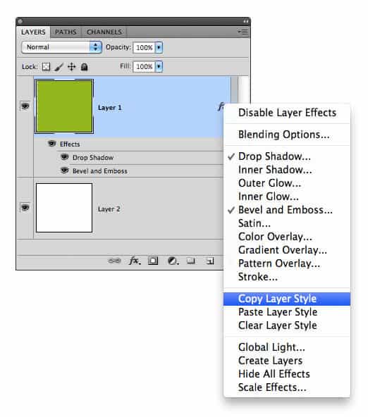 Even better, you can copy and paste those styles to other layers to more quickly duplicate a visual treatment. Just right click on the layer with the style applied to it.