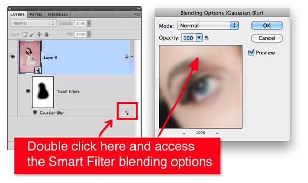 You can also play with this little button on the Smart Filter to adjust the appearance through blend modes and opacity separately from the blend options of the layer itself.