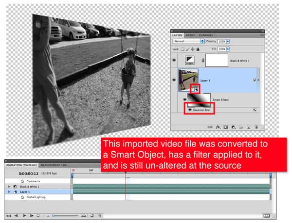 You can even convert imported video clips to Smart Objects allowing you to modify the design without damaging the video. They can be resized, skewed, and so much more. This means I can take that quick little snippet of a video that I need to look blurred and add a filter to it. Then, just re-export the video from Photoshop and drop back into my project.