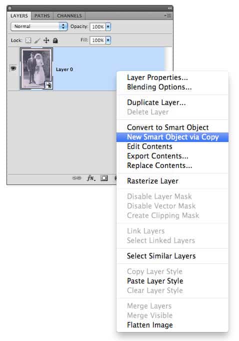 Tip: If you want to have duplicates of the Smart Object layer you must decide how future edits might happen to that Smart Object. So if you duplicate that layer multiple times the traditional way (drag to new layer icon, or Cmd/Ctrl + J), then when you double click to edit one of the Smart Objects, you’re in essence editing ALL the Smart Objects that were duplicated from that source. To get around this, make sure you go to the menu item under Layers > Smart Objects > New Smart Object Via Copy and then it’ll be seen as a different source for the duplicated layer.