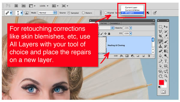 Cloning, Healing, Stamping, Patching, are great tools to use for repairing or altering images. But usually we do it directly on the picture. Instead, create a new layer and in the options bar choose “Use All Layers” this way you’re making your repairs to a blank new layer rather than the image layer itself. Nothing destroyed!